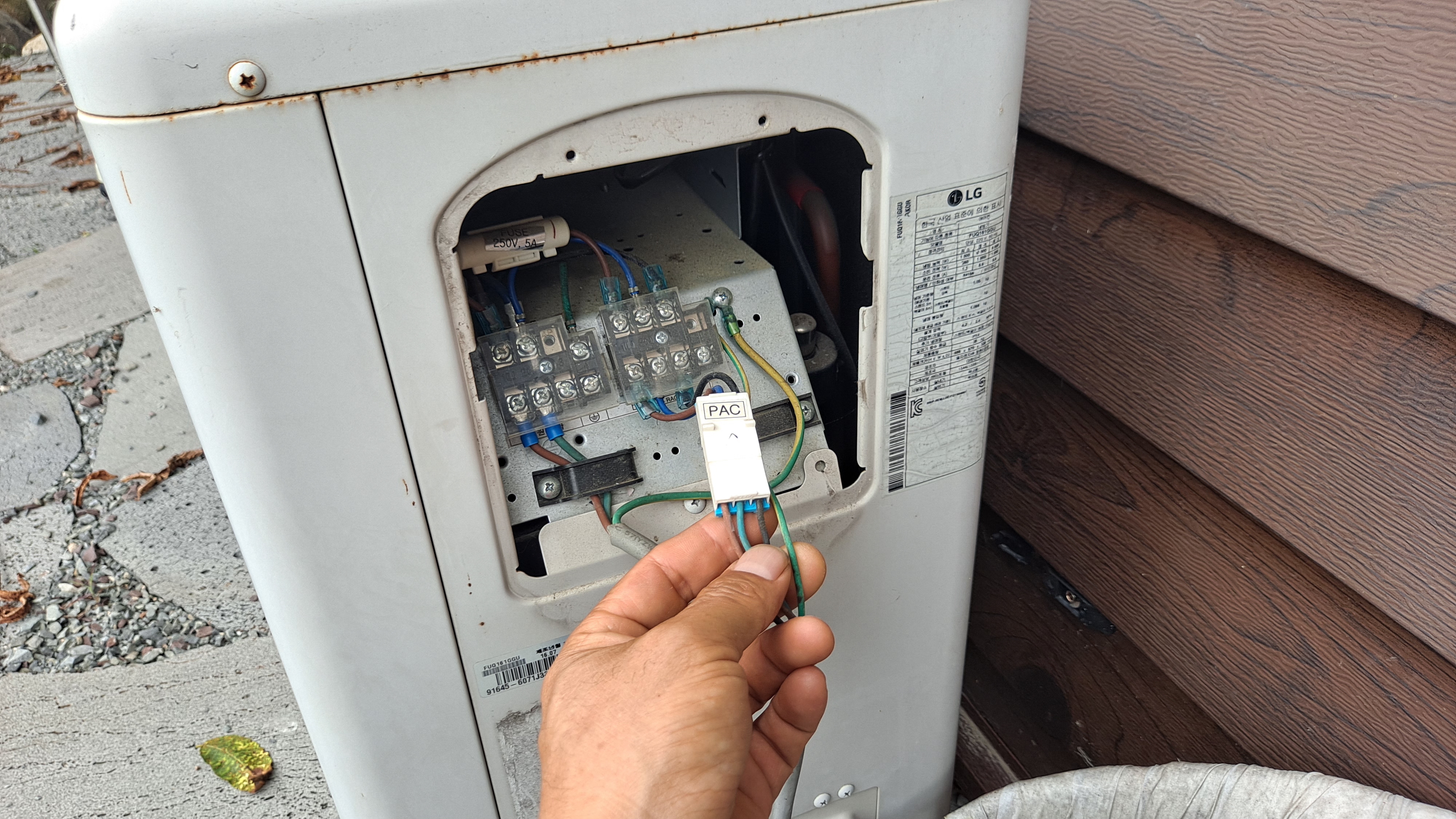 실외기에 네 가닥 선이 체결된 곳에 같은 색깔끼리 연결하면 됩니다. 원래 선은 제거하면 됩니다.